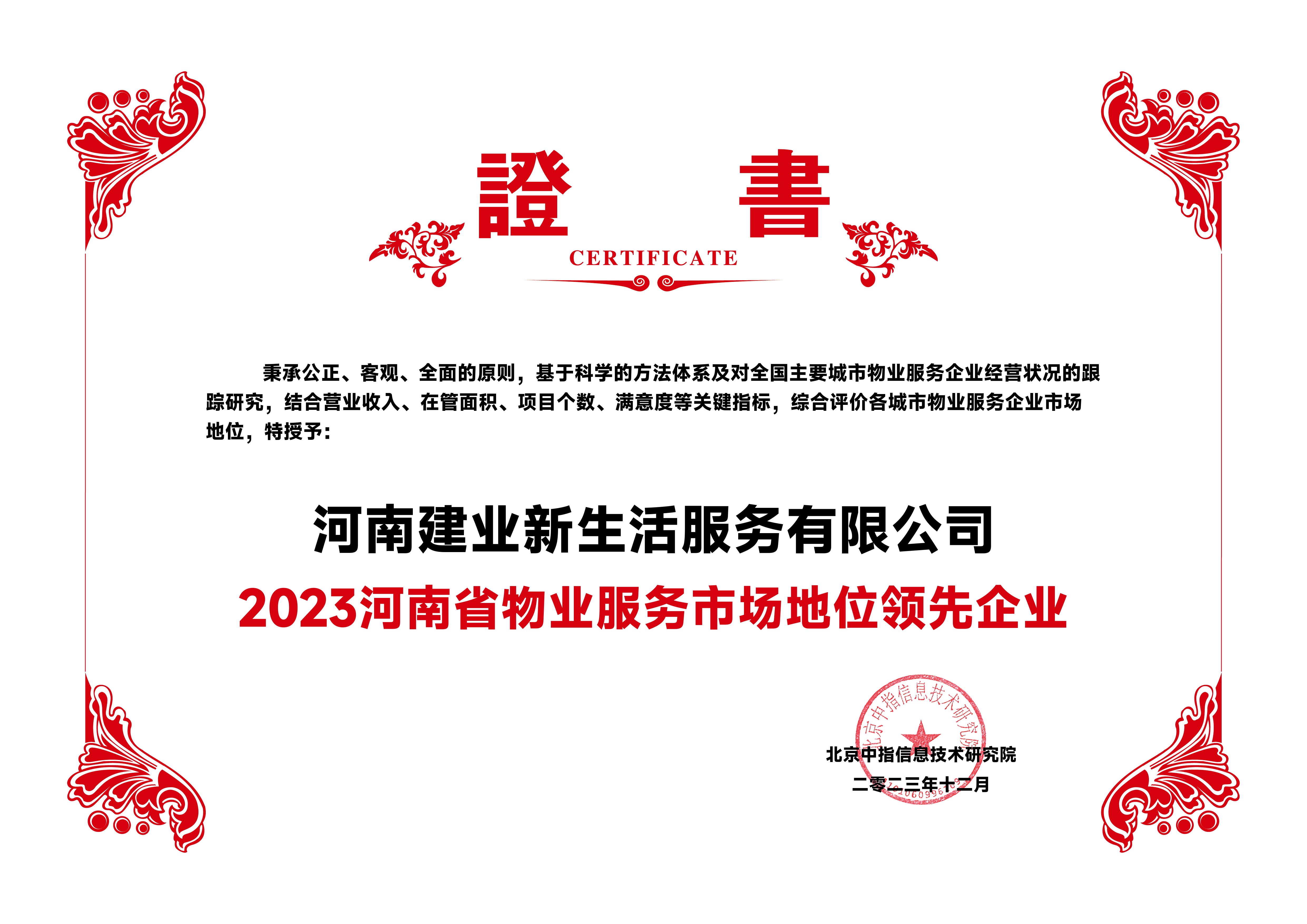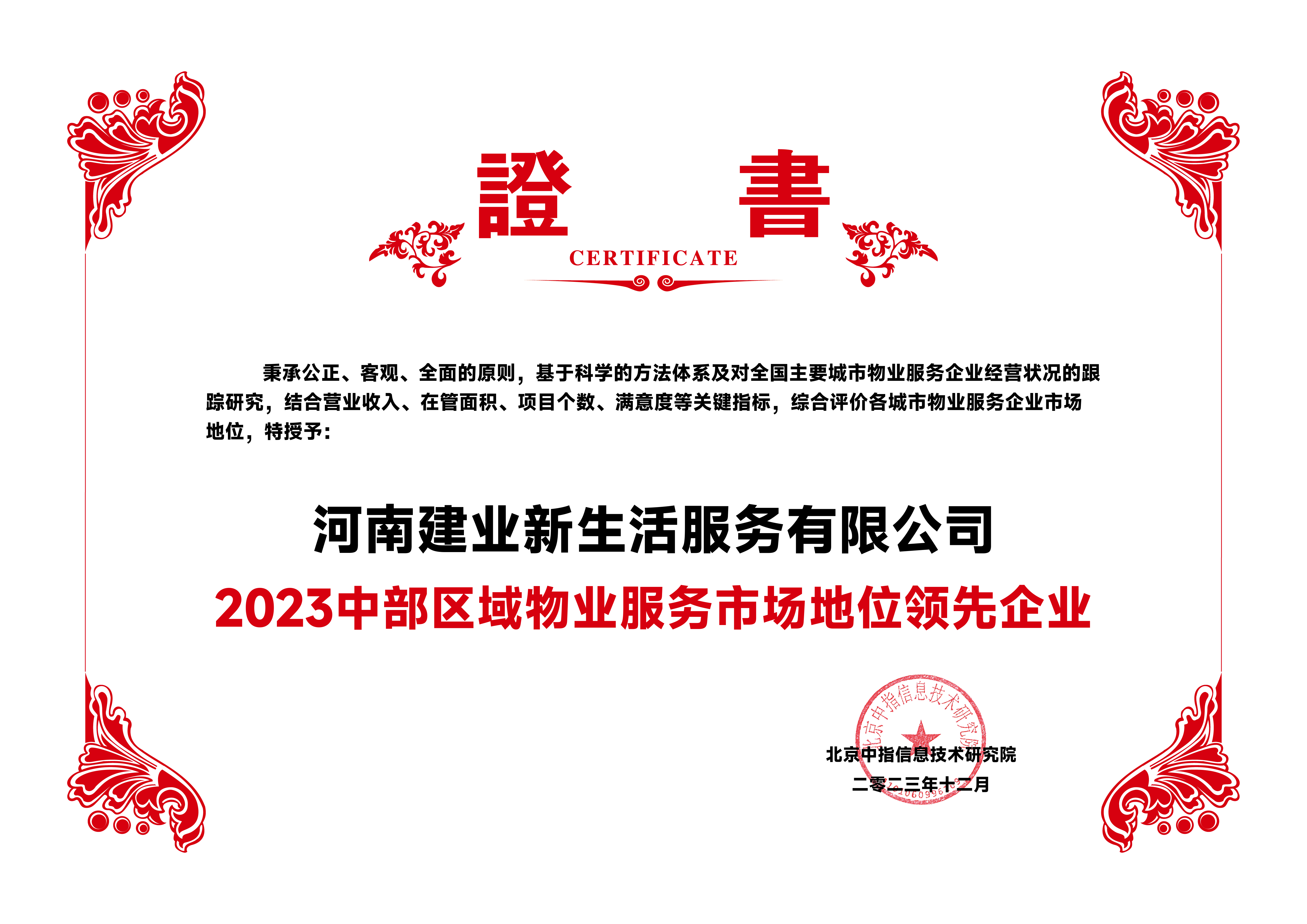 2023年12月7日,由北京中指信息技術(shù)研究院主辦,中國房地產(chǎn)指數(shù)系統(tǒng)、中國物業(yè)服務(wù)指數(shù)系統(tǒng)承辦的“2023中國房地產(chǎn)大數(shù)據(jù)年會暨2024中國房地產(chǎn)市場趨勢報告會”在北京隆重召開。河南建業(yè)新生活服務(wù)有限公司憑借雄厚的綜合實力,榮膺“2023中部區(qū)域物業(yè)服務(wù)市場地位領(lǐng)先企業(yè)(TOP1)”“2023河南省物業(yè)服務(wù)市場地位10強企業(yè)(TOP1)”。