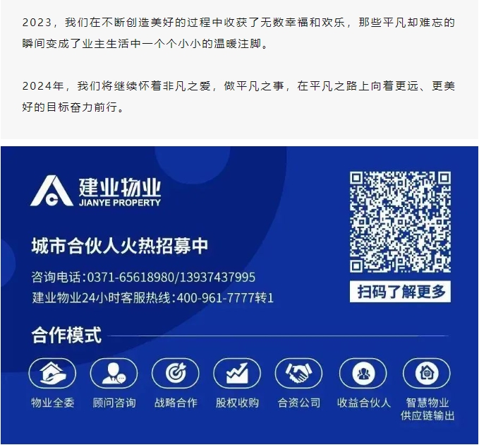 這一年,我們以各條線大比武淬煉一線服務(wù)技能、以系列專項(xiàng)行動持續(xù)提升物業(yè)服務(wù)品質(zhì)、以多樣的幸福時(shí)光里活動豐富業(yè)主生活、以強(qiáng)大的綜合實(shí)力贏得多項(xiàng)榮譽(yù)……這一年,建業(yè)物業(yè)人在平凡的崗位上,不斷創(chuàng)造美好,以更好的面貌來迎接建業(yè)物業(yè)的第30年。